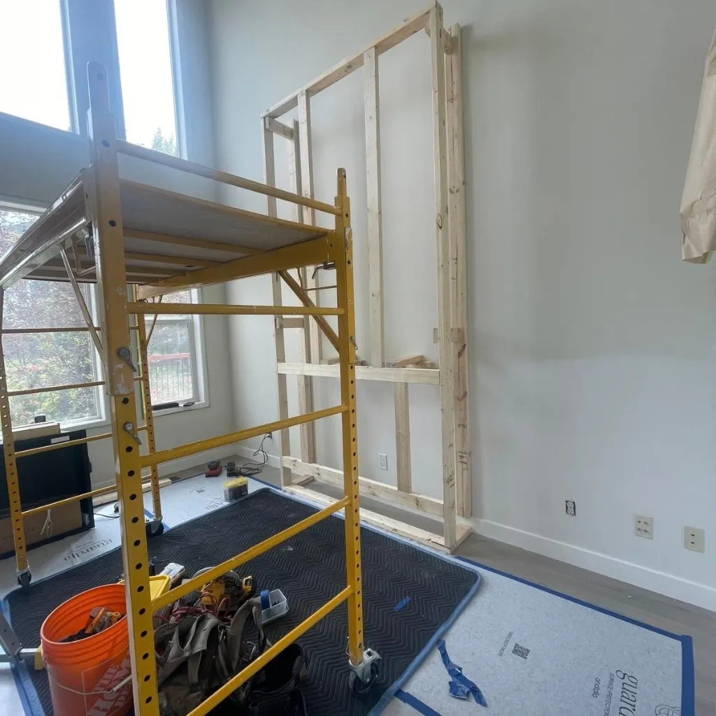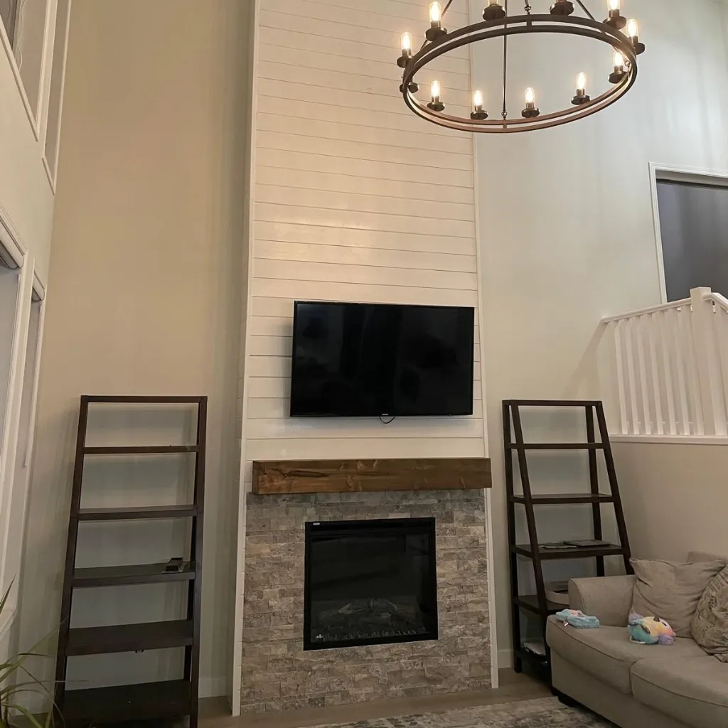 Let us redefine your living space with a floor-to-ceiling fireplace transformation that radiates warmth and modern style. We paired clean white shiplap with a rustic, handcrafted wood mantel and textured stone masonry to create a high-impact focal point. From the precise mounting of the media center to the artisanal finish of the woodwork, our team ensures a seamless, high-quality experience that elevates the heart of your home.